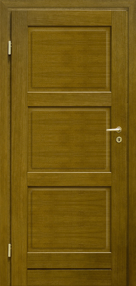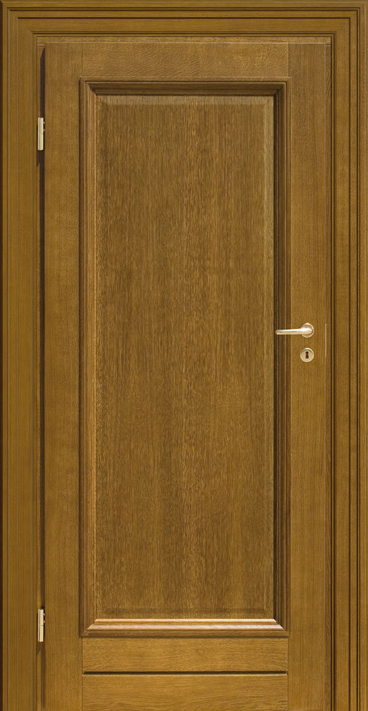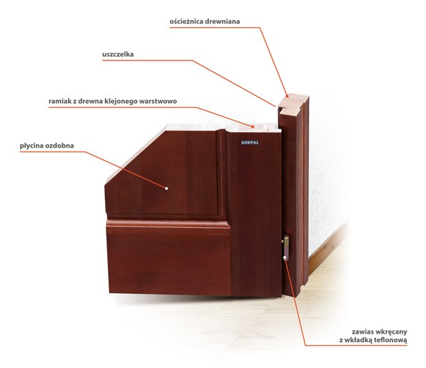 Drzwi mogą być wykonane w całości z drewna litego lub ramiaka - drewnianego klejonego warstwowo. Jako wypełnienie części drzwi stosuje się wkłady z drewna, płyty MDF lub szkła. Zewnętrzną warstwą jest zwykle okleina naturalna o grubości przekraczającej nawet 1,5 mm. Powłoka barwiona jest bejcą w jednym z kilkudziesięciu kolorów lub lakierem bezbarwnym, a ostateczną warstwą wykończeniową jest bezbarwny lakier poliuretanowy, który odznacza się wysoką odpornością na ścieranie, zarysowana i uszkodzenia mechaniczne.
